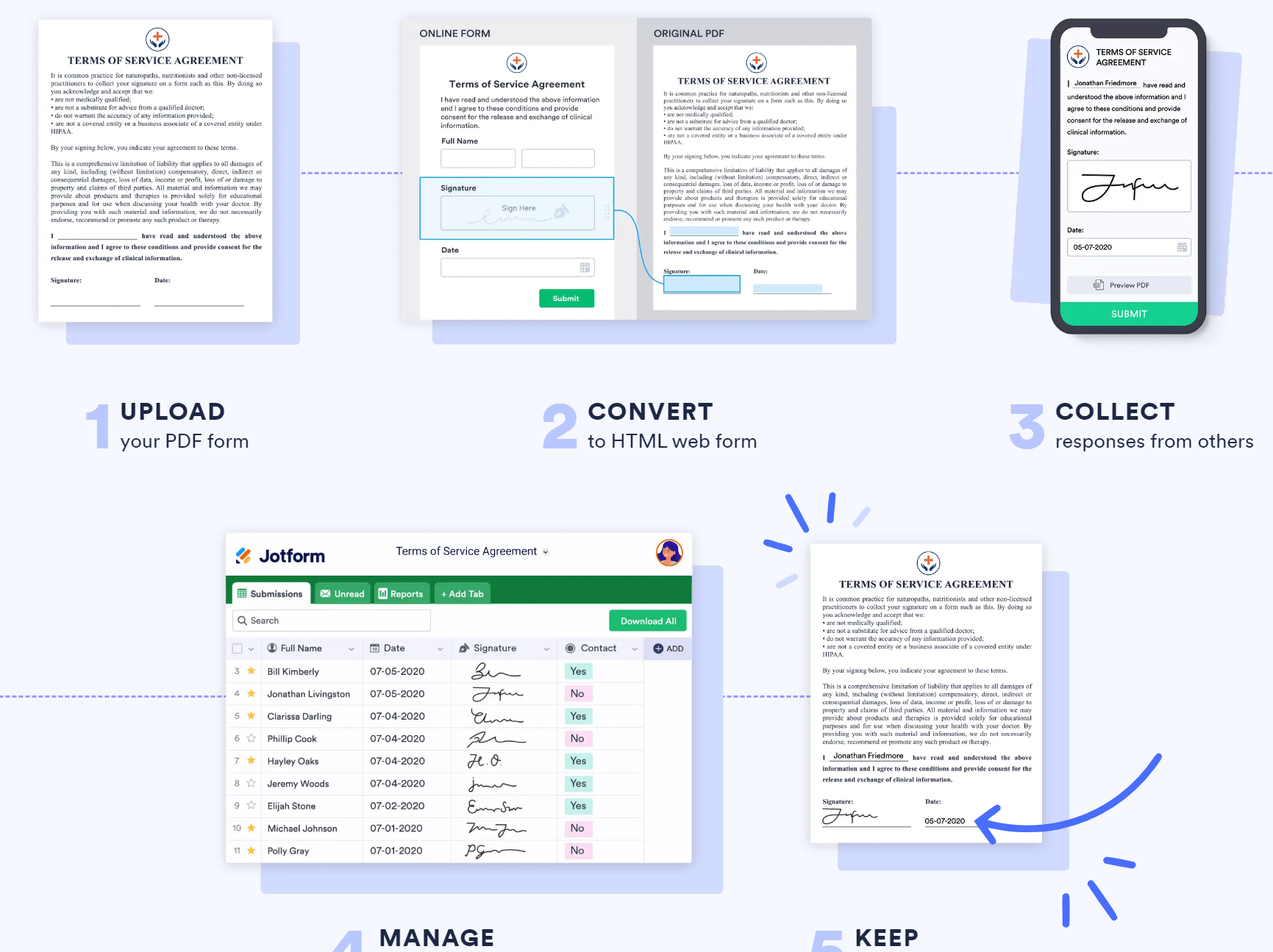 JotForm’s Smart PDF Forms: you upload a PDF, and your online form fields are instantly connected to the corresponding sections of your PDF.